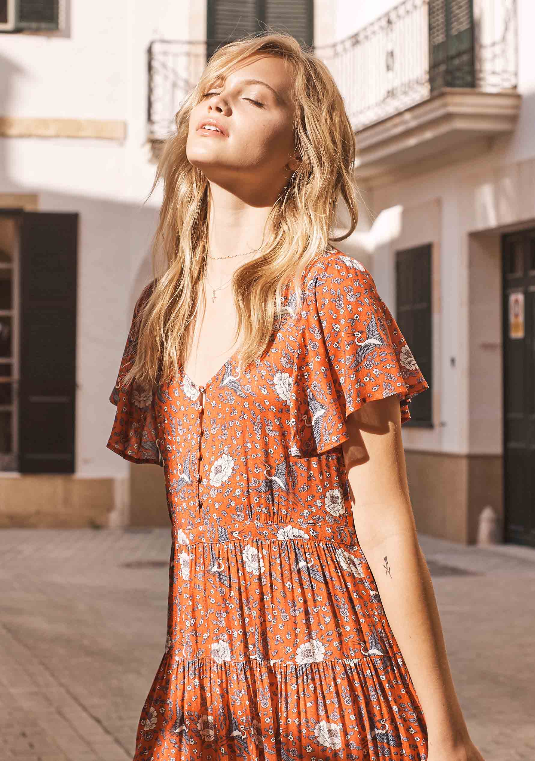 Made for all kinds of magic, the Valentina Fiesta Day Dress is boldly feminine with effortless appeal. Stitched together in a relaxed cut with a button-down top, frill sleeves and sweet pockets, its patterned rayon fabric features a thread of gold lurex for that subtle sparkle.